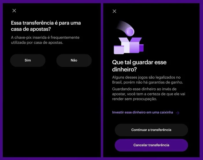 O Nubank adicionou uma nova funcionalidade ao seu aplicativo que alerta clientes ao realizarem transferências via Pix para casas de apostas, as famosas “bets“.